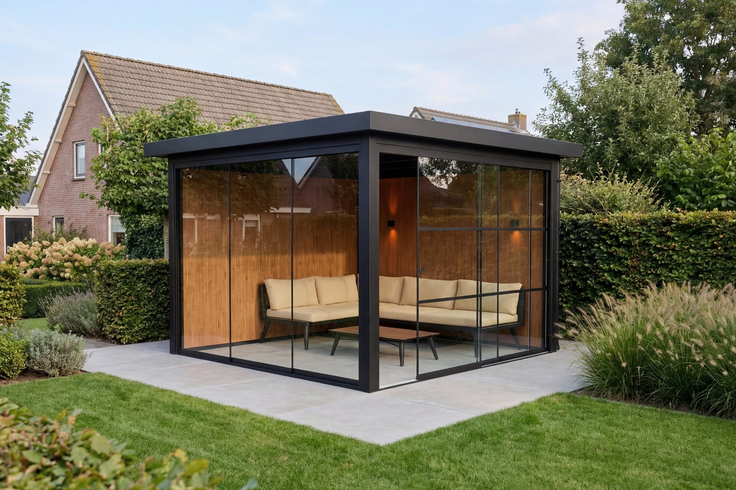 Das Panorama Base ist ein kompakter Gartenraum mit gemütlichem Sitzbereich und einer festen Glas-Seitenwand. Dank des offenen Designs und der durchdachten Raumaufteilung genießen Sie maximales Licht, Ausblick und Schutz. Die pulverbeschichtete Stahlkonstruktion in RAL 9004 bildet einen markanten Kontrast zur warmen Wandverkleidung aus Kunststoff oder Bambus – und macht das Panorama Base zu einer stilvollen Ergänzung für jeden Garten oder jede Terrasse.