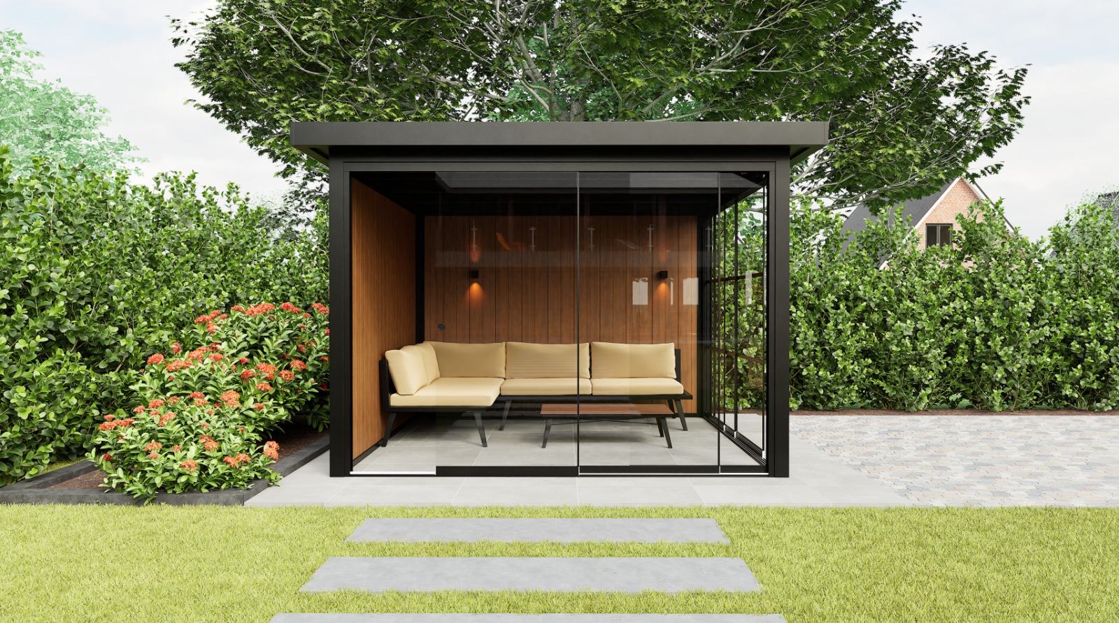 Das Panorama Base ist ein kompakter Gartenraum mit einem stimmungsvollen Sitzbereich und einer festen Glas-Seitenwand. Die pulverbeschichtete Stahlkonstruktion in RAL 9004 bildet einen starken Kontrast zur warmen Wandverkleidung.