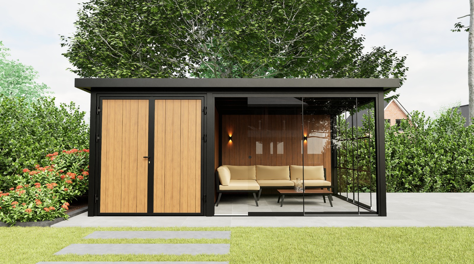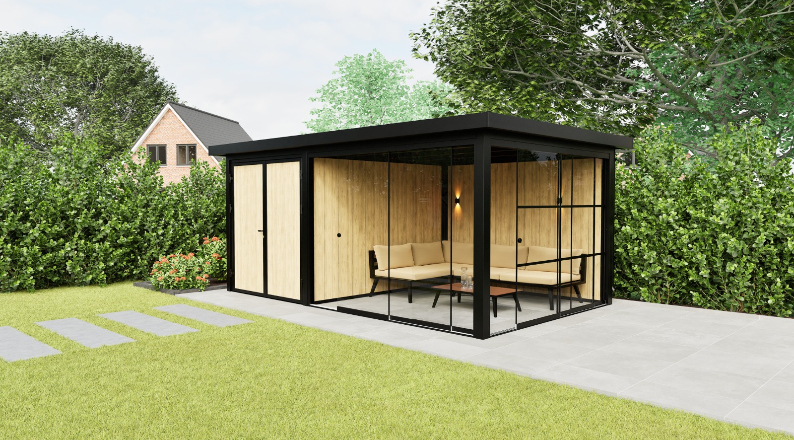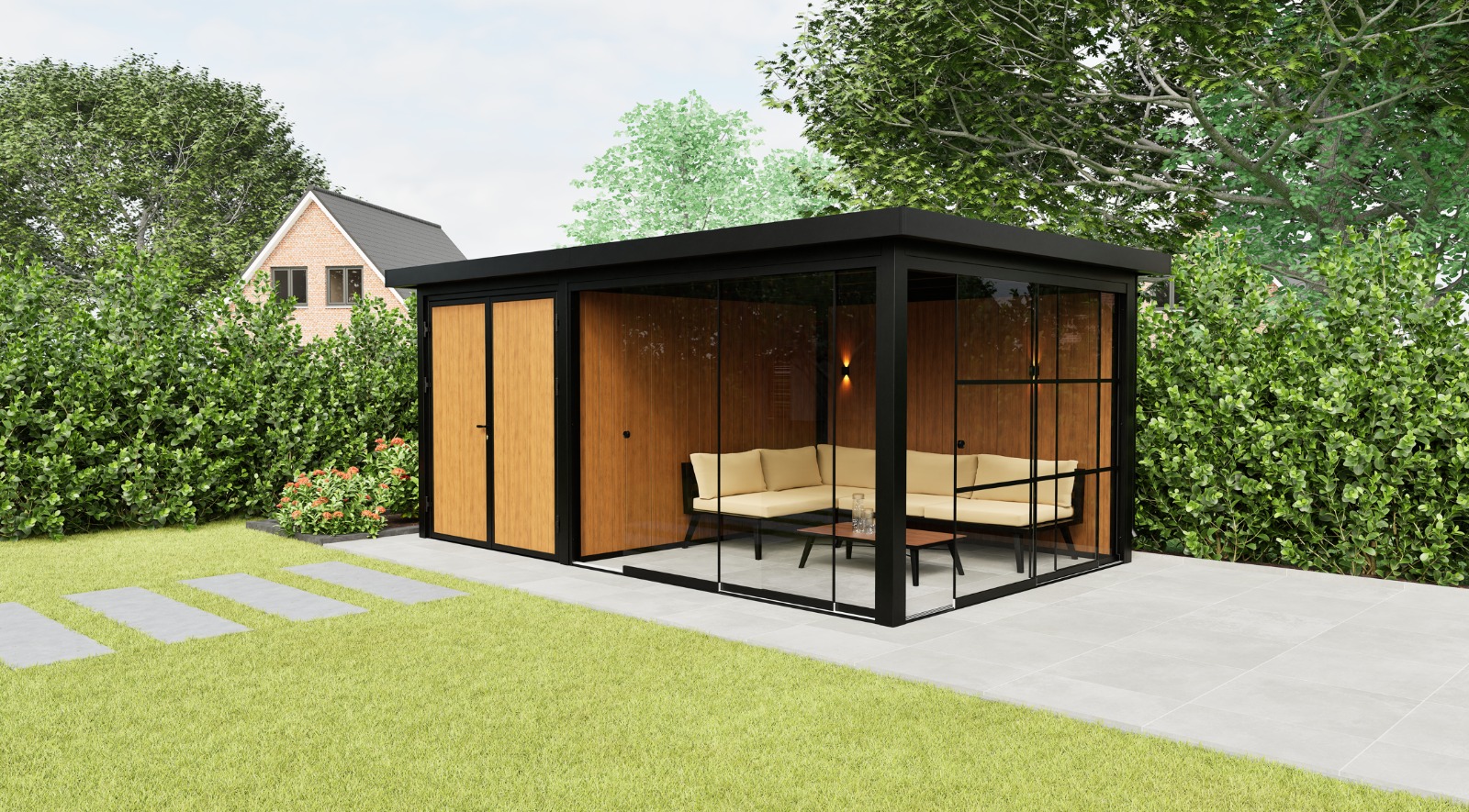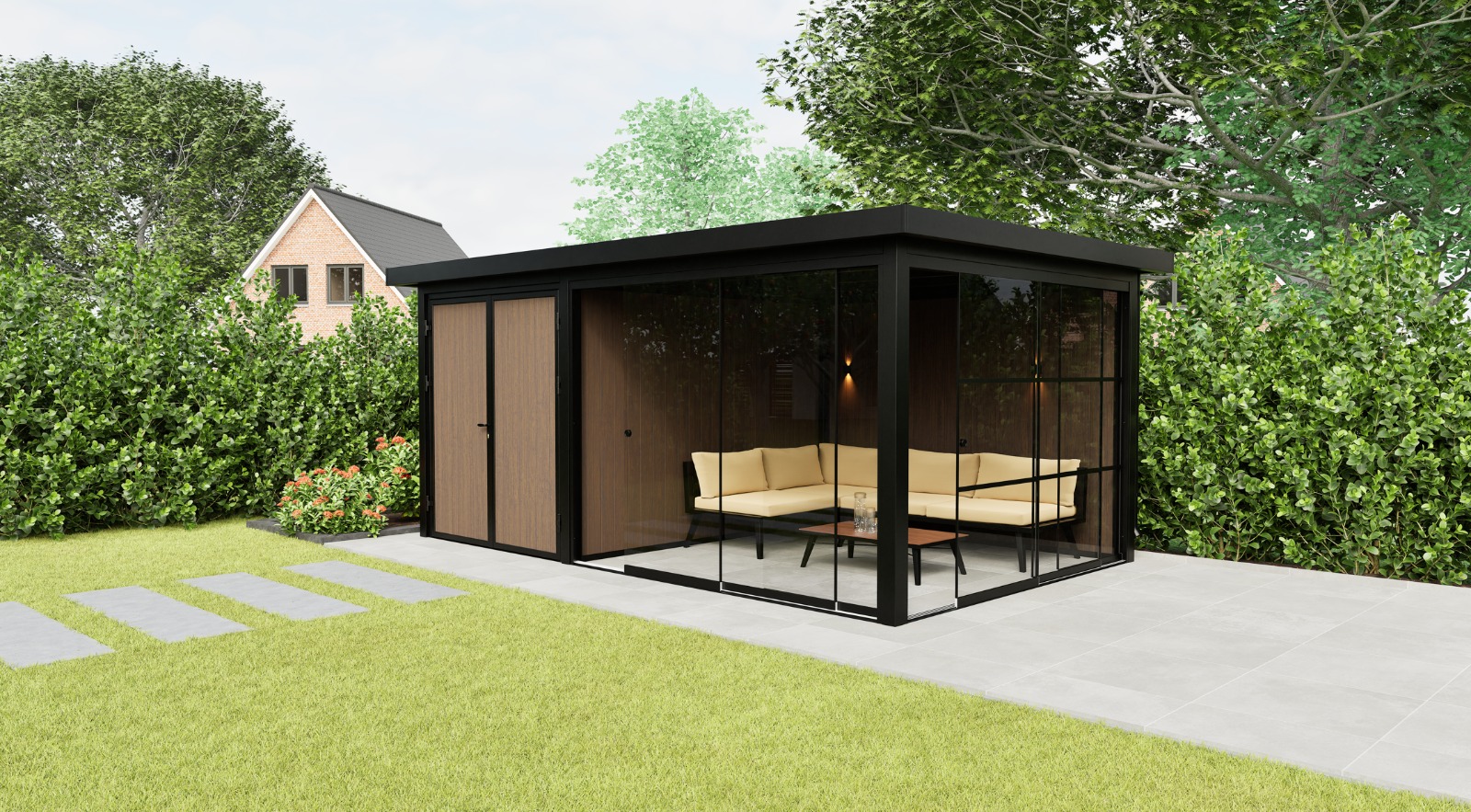 Die Panorama Essence ist eine großzügige Gartenlounge mit Sitzbereich und integriertem Stauraum. Eine Glas-Seitenwand sorgt für zusätzliches Licht und ein offenes Raumgefühl, während die tragende Konstruktion in elegantem Schwarz (RAL 9004) einen kraftvollen und zugleich raffinierten Kontrast schafft.