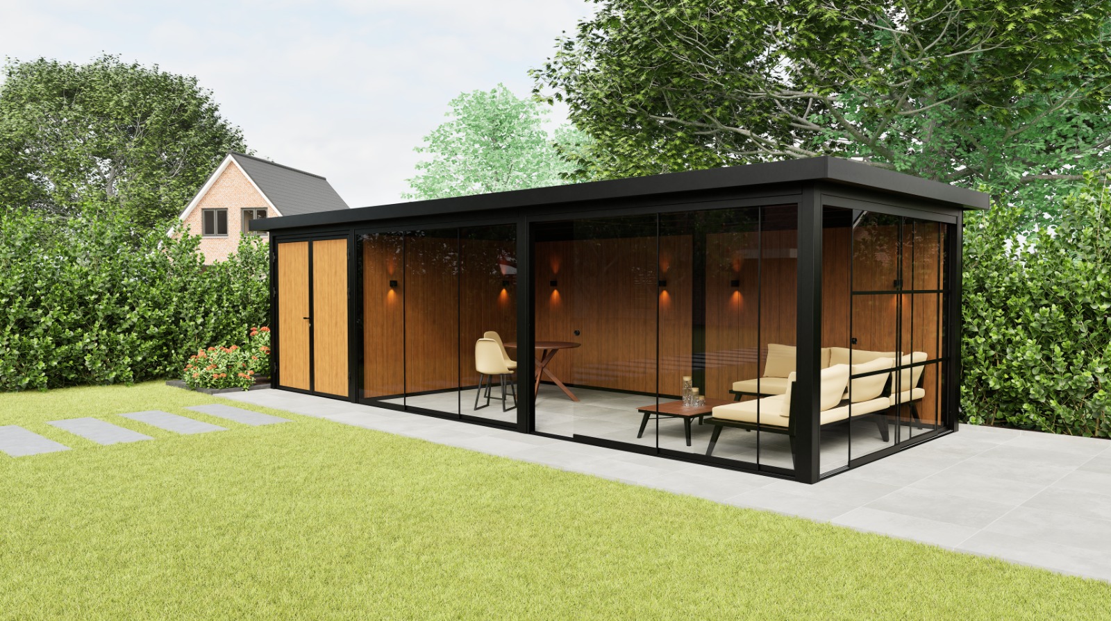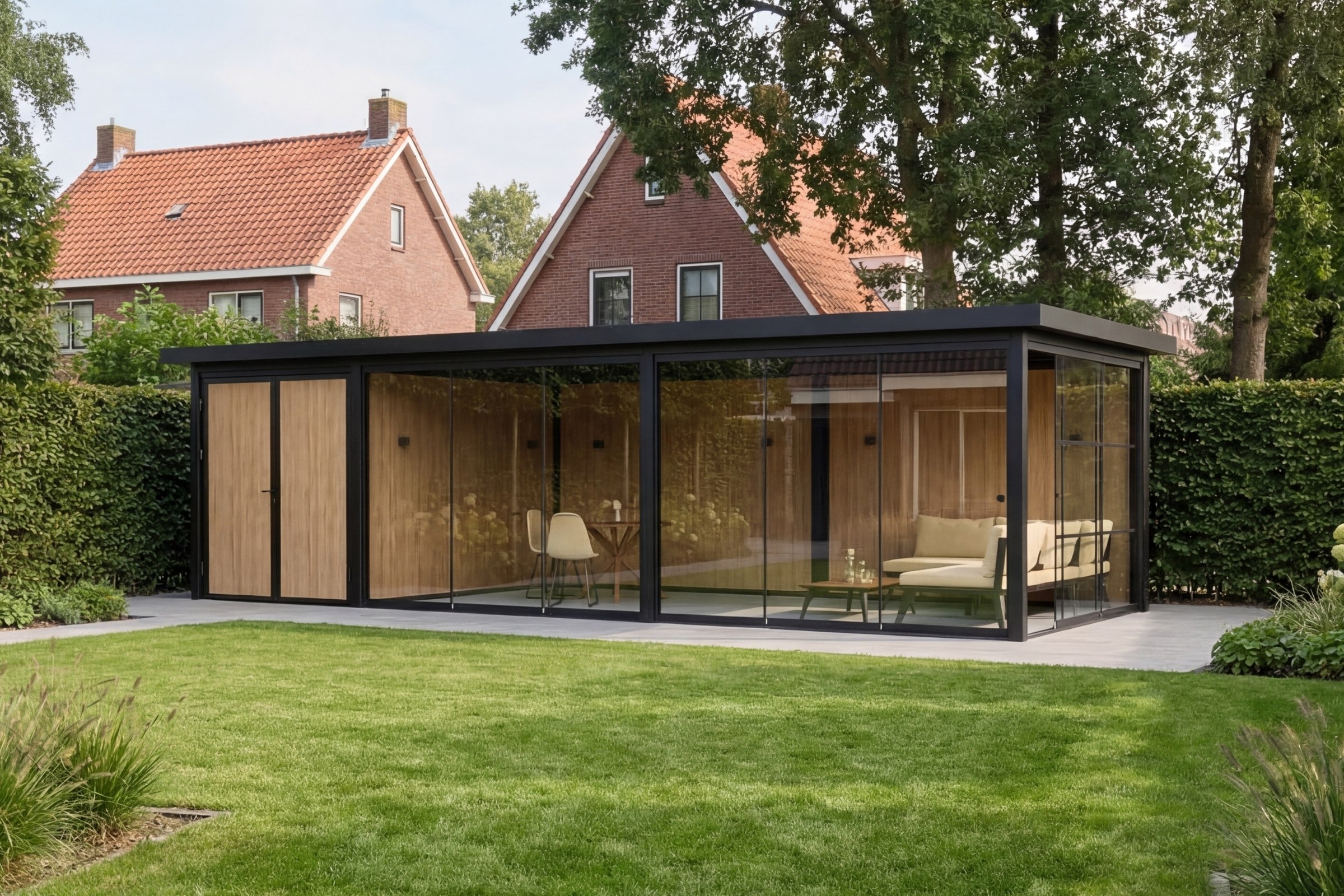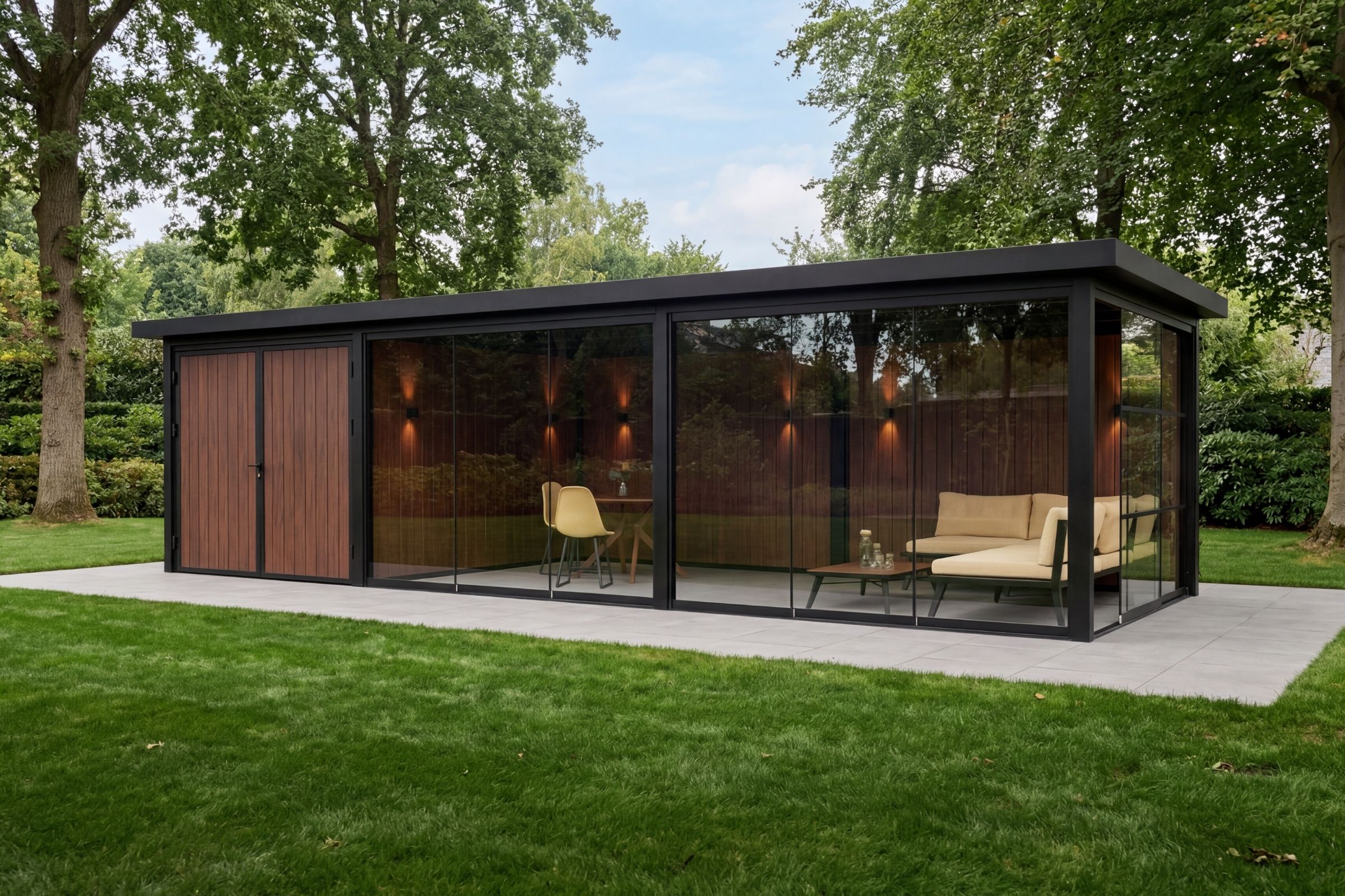 Das Panorama Prestige ist die großzügige Erweiterung unseres Modells Panorama Essence. Dieser Gartenraum kombiniert eine extra große Sitzecke mit einem integrierten Stauraum und einer festen Glas-Seitenwand, die für Licht, Offenheit und Verbindung zur Umgebung sorgt. Die ausgewogene Kombination aus tiefschwarzer Stahlkonstruktion (RAL 9004) und warmer Wandverkleidung macht das Prestige nicht nur funktional, sondern auch zu einem echten Blickfang in jedem Garten.