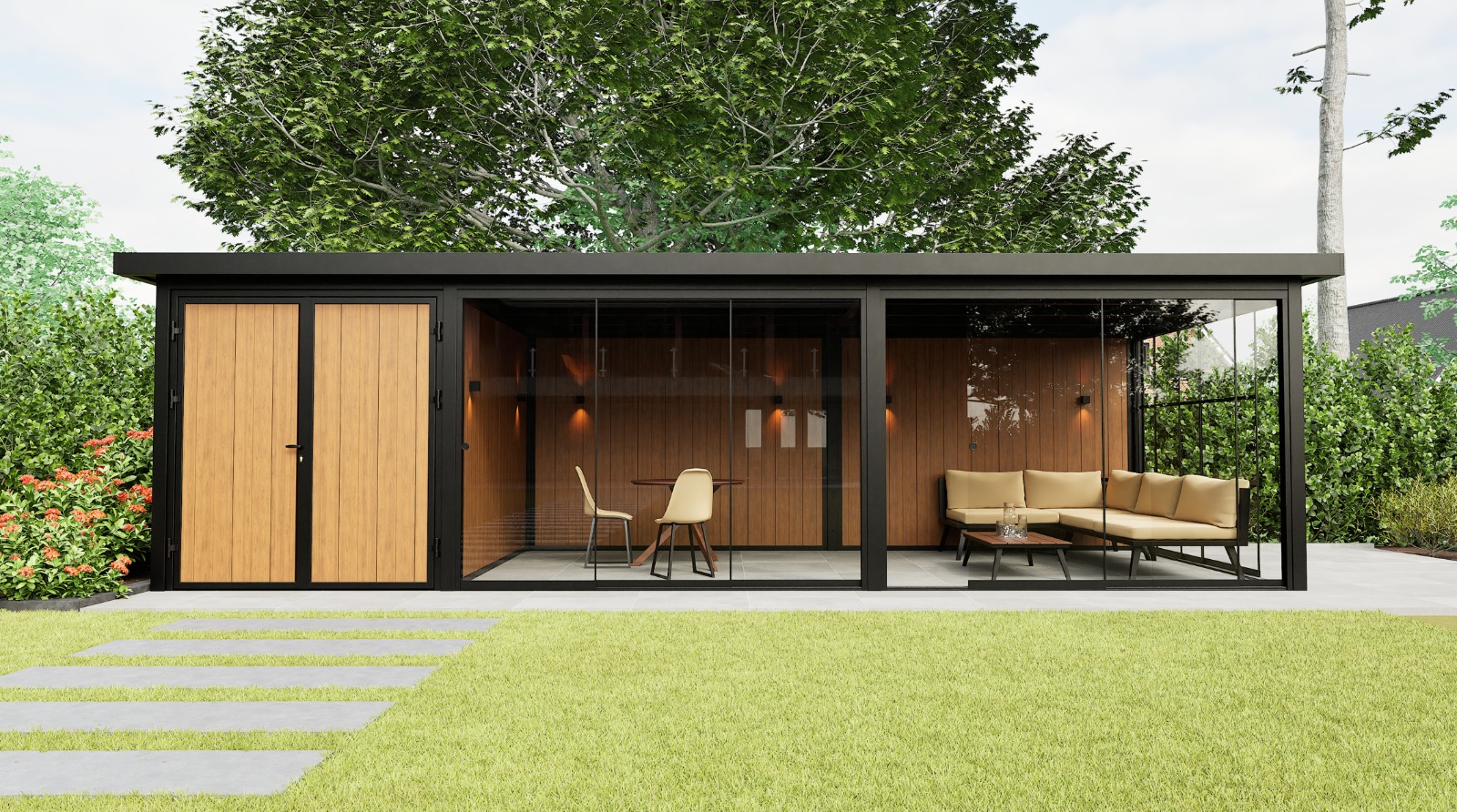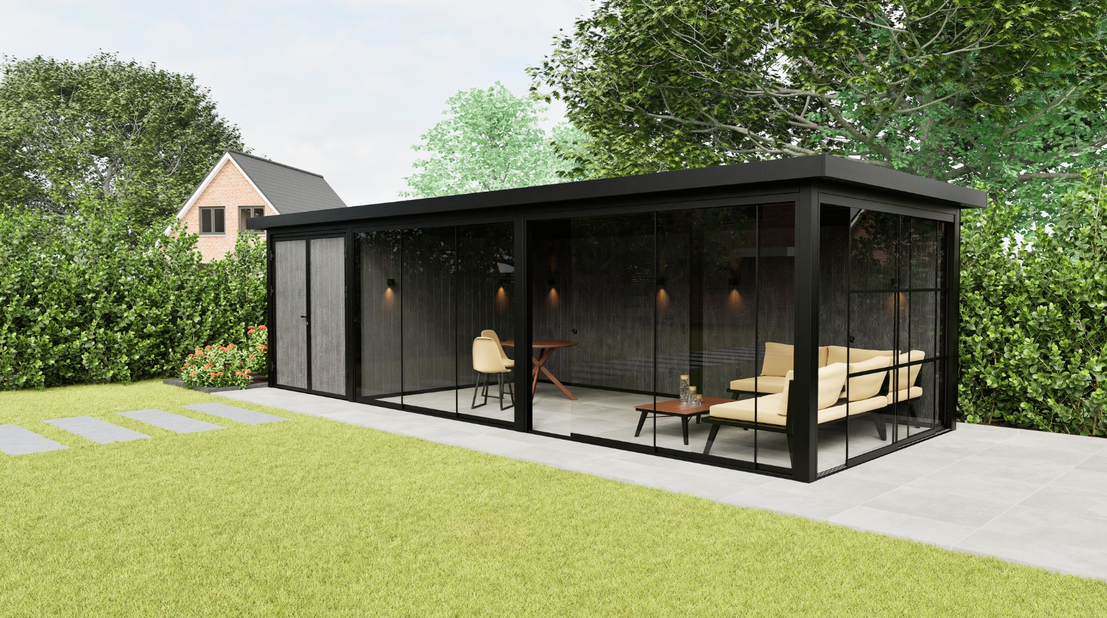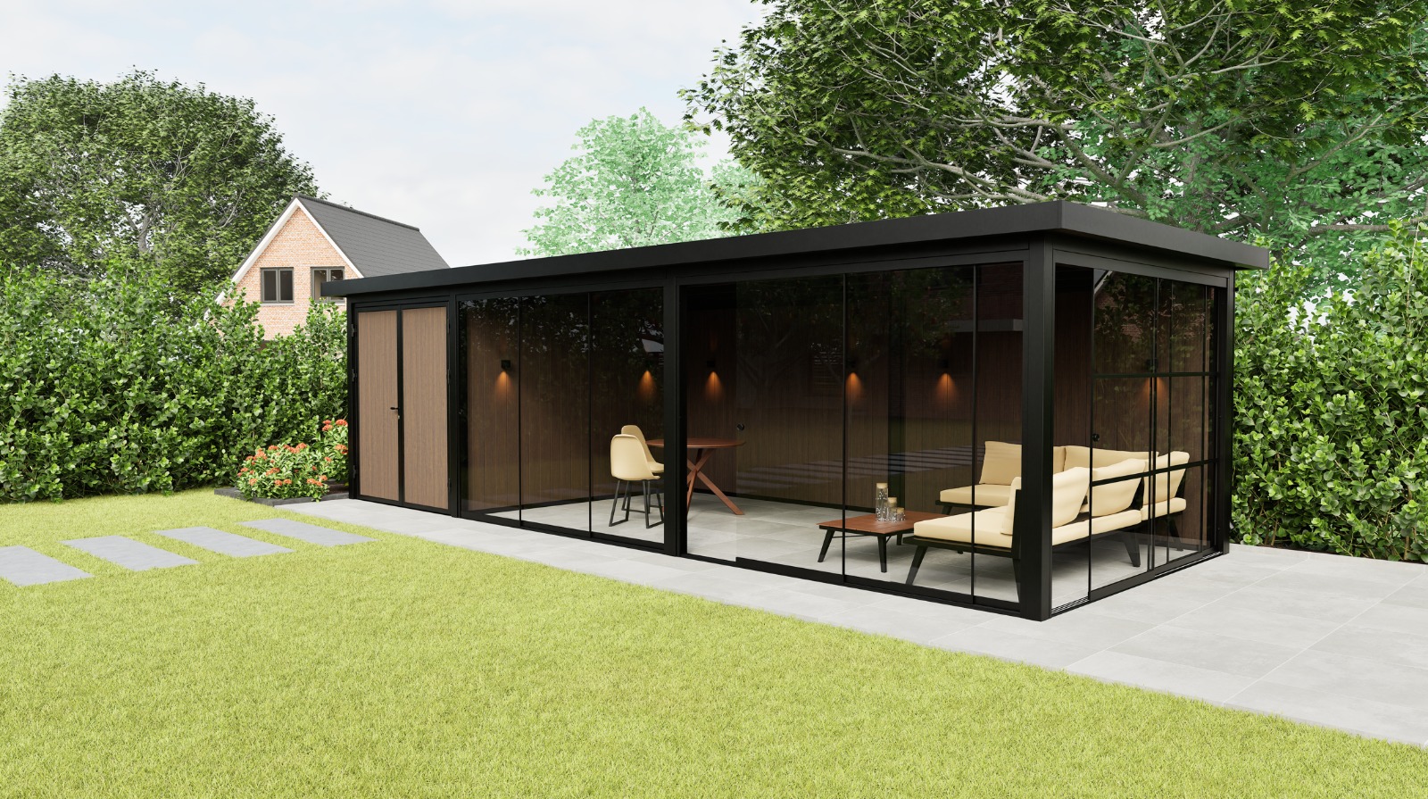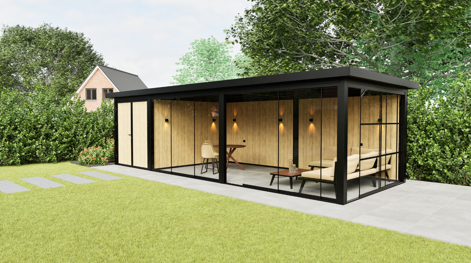 Das Panorama Prestige ist die großzügige Erweiterung unseres Modells Panorama Essence. Dieser Gartenraum kombiniert eine extra große Sitzecke mit einem integrierten Stauraum und einer festen Glas-Seitenwand, die für Licht, Offenheit und Verbindung zur Umgebung sorgt. Die ausgewogene Kombination aus tiefschwarzer Stahlkonstruktion (RAL 9004) und warmer Wandverkleidung macht das Prestige nicht nur funktional, sondern auch zu einem echten Blickfang in jedem Garten.