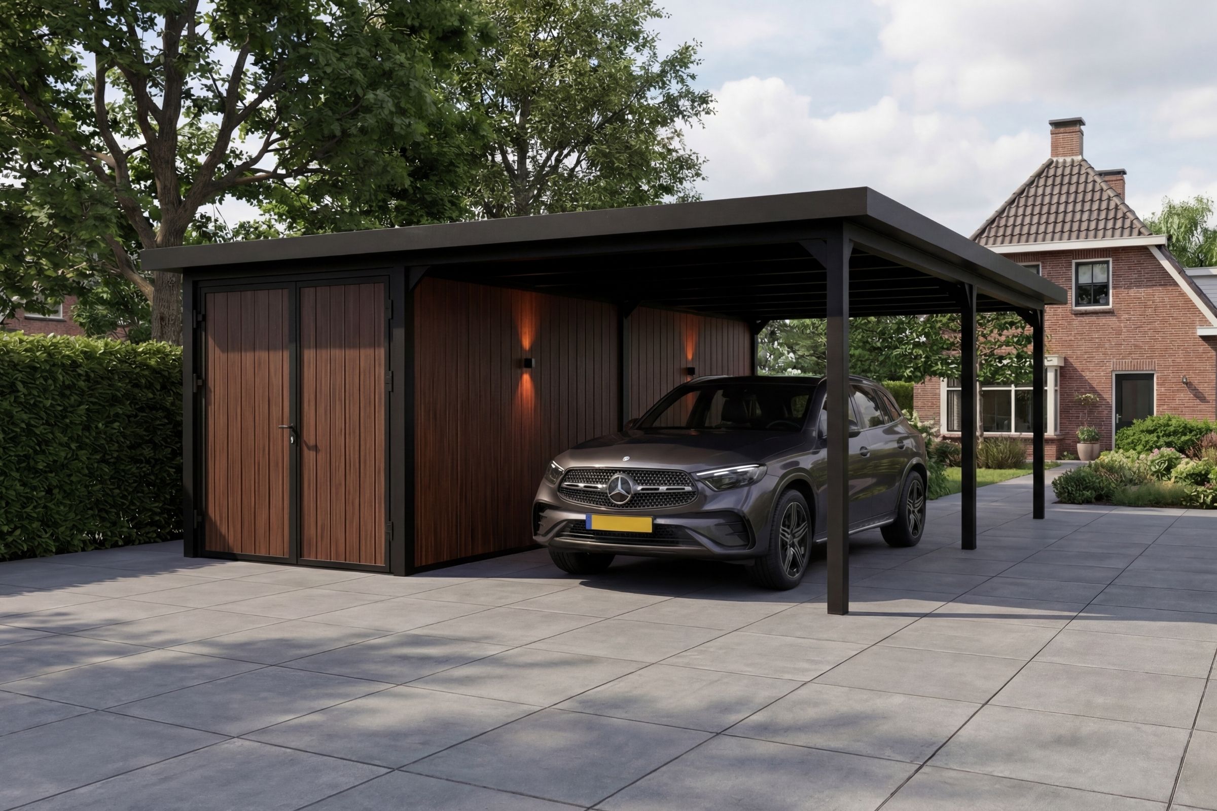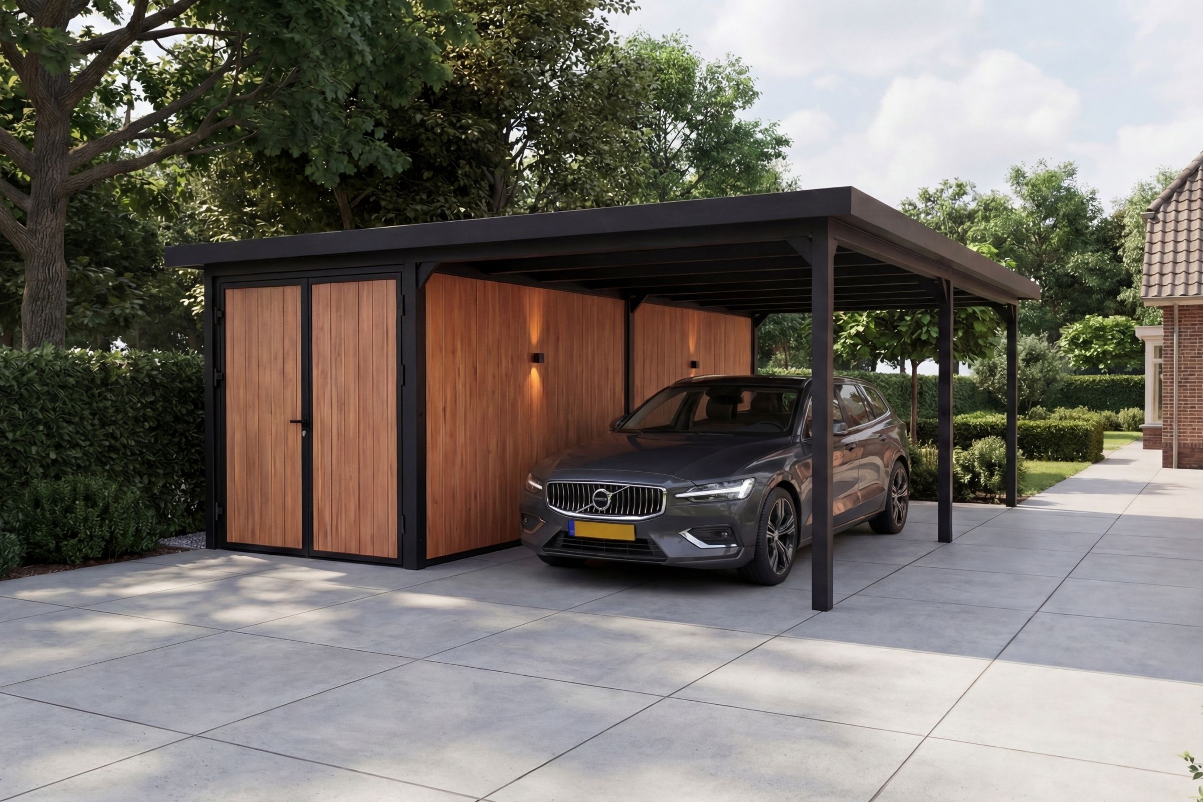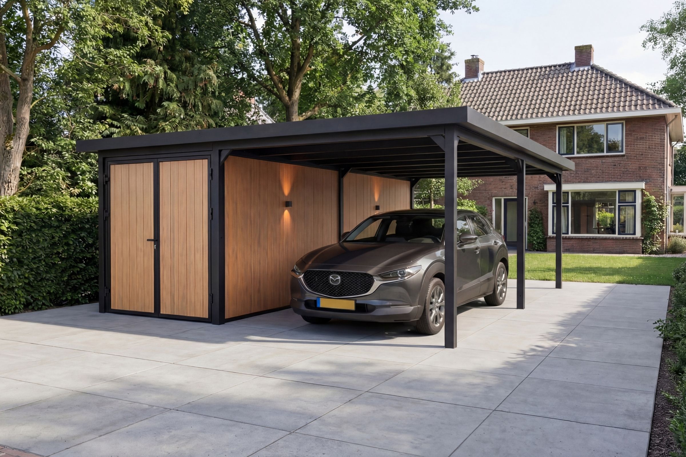 Der Stauraum der Solara Elevate ist tiefer als bei anderen Modellen der Serie und bietet damit zusätzliche Kapazität – ideal für größere Gegenstände wie Fahrräder, Gartenmöbel oder Werkzeuge. Die weitläufige Überdachung macht die Elevate zu einer vollwertigen Lösung für funktionale und zugleich stilvolle Außengestaltung.