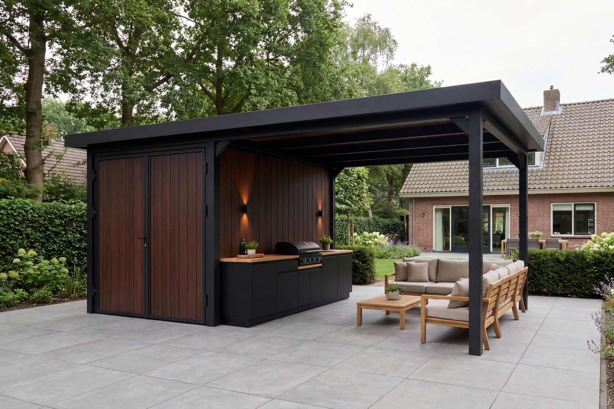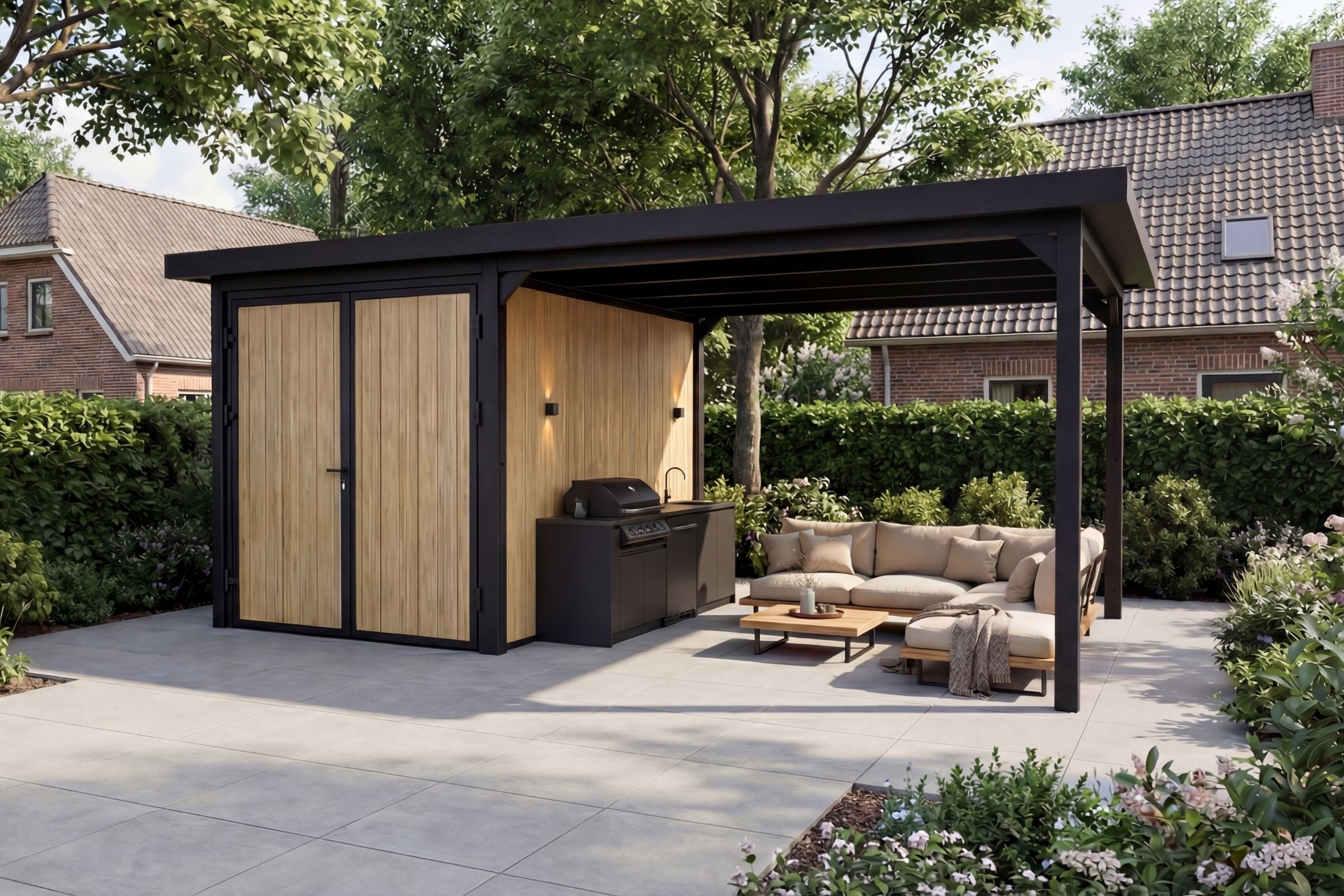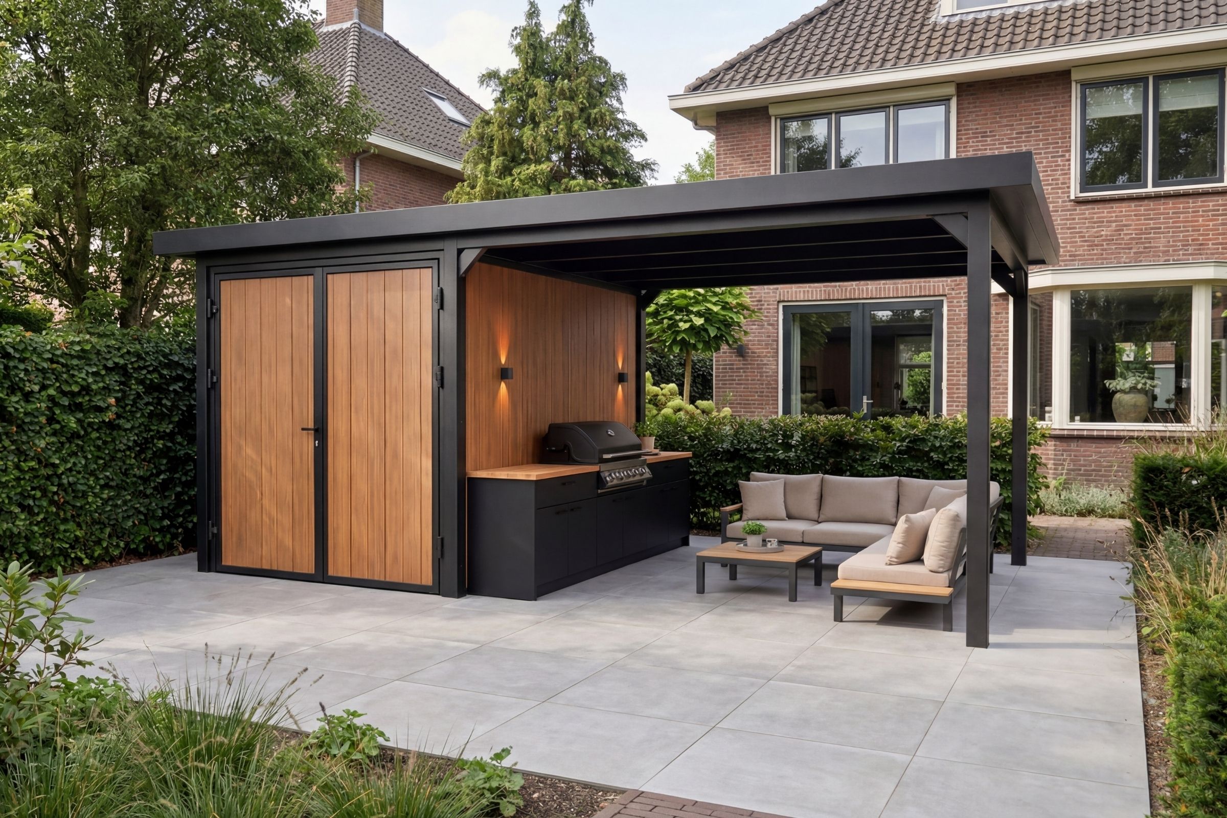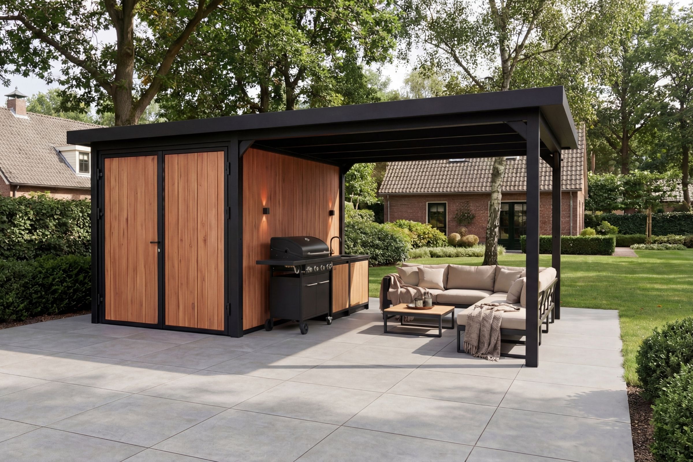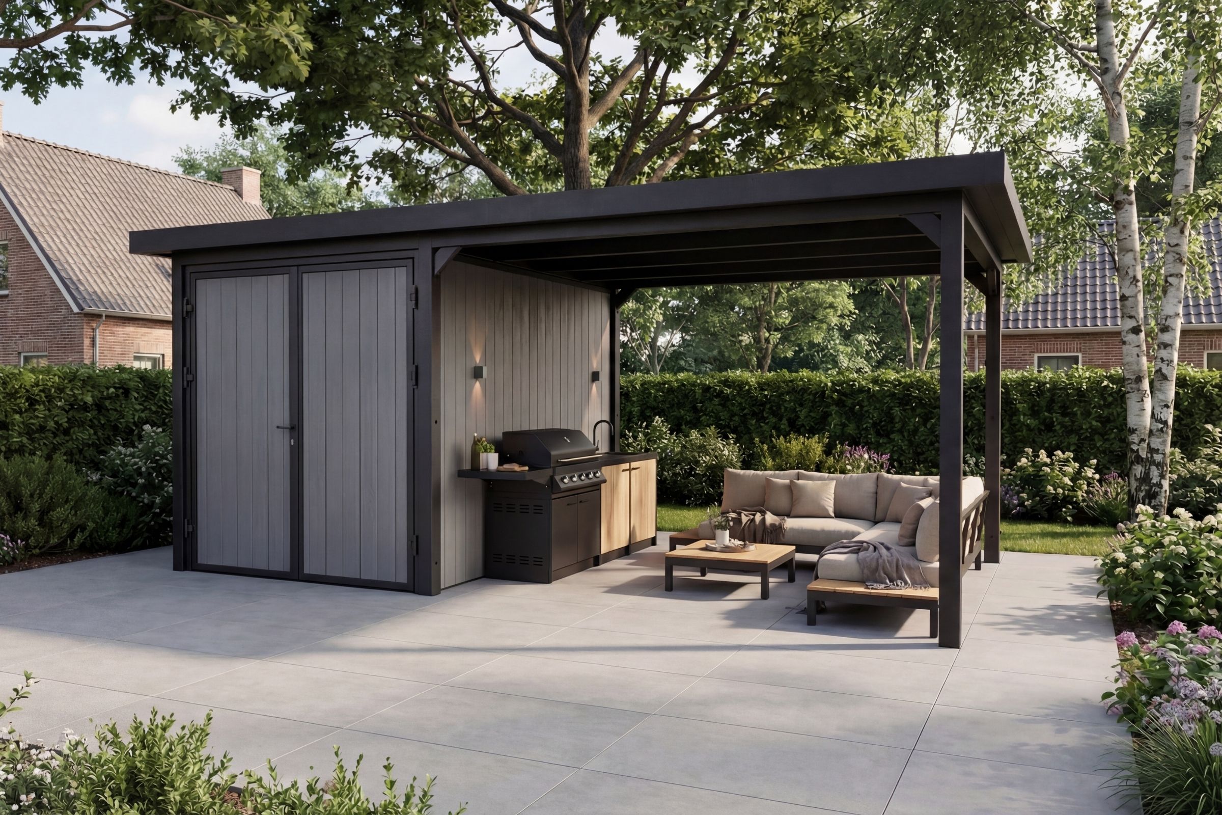 Der integrierte Stauraum ist dezent im Design verborgen, bietet jedoch ausreichend Platz für Gartengeräte, Fahrräder, Polster oder Grillzubehör. Der überdachte Bereich ist großzügig bemessen – ideal für eine Sitzecke, einen Arbeitsplatz oder eine Außenküche. Eine feste Rückwand schützt vor Wind, während die offenen Seiten für ein luftiges, offenes Raumgefühl sorgen.